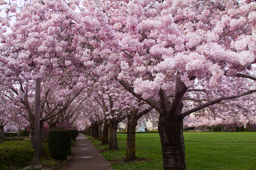 The image depicts an outdoor scene featuring a path lined with cherry blossom trees in full bloom, showcasing vibrant pink flowers against the backdrop of a clear sky.
