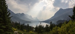 This is an image of a serene mountain landscape at sunset or sunrise, featuring a calm lake surrounded by lush green trees and mountains in the distance. The sky has wispy clouds and patches of blue with rays of light beaming down through them, creating a peaceful atmosphere.