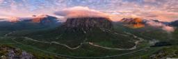 This is an image of a mountainous landscape during sunset, featuring the soft hues of pink and orange blending into blue in the sky, with clouds partially obscuring the view.