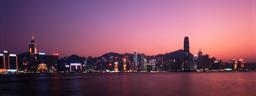 The image is a vertical panorama of a cityscape at dusk or dawn, with buildings and lights reflecting on water below. The sky has a soft gradient from purple to pink, suggesting either the early morning 'golden hour' or the late evening period before complete darkness.