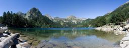 A picturesque, natural landscape featuring a serene lake surrounded by trees and mountains, under a clear blue sky on what appears to be a sunny day.