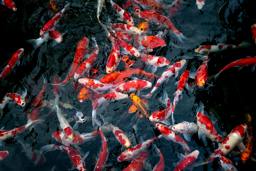 This is an image of several Koi fish, which are a common breed of goldfish. The photo shows the vibrant orange and red colors with black markings that are characteristic of these fish. They appear to be in good health and are likely swimming in a pond or small pool at a location where they are well cared for.