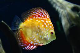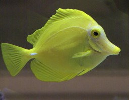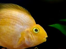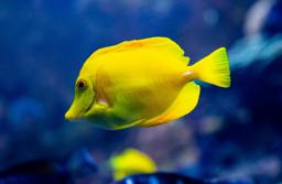 This image features a single yellow fish swimming against a dark background, possibly in an aquarium or deep water environment. The fish has prominent eyes and scales, giving it a vibrant appearance.