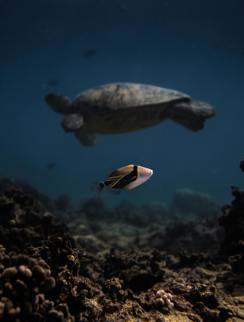 The image captures an underwater scene featuring two distinct types of sea creatures. In the foreground, there is a vibrant and colorful fish with yellow fins swimming above some rocks covered in coral. The coral has shades of green and brown, suggesting it could be part of a reef. Further back, we can observe a larger creature, possibly a turtle or tortoise, moving towards the viewer. The background is a deep blue ocean floor with a few small white fish swimming about.