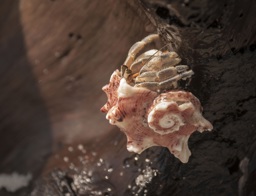 This is an underwater photograph showing a sea snail, also known as a nudibranch or shellfish, with intricate details and patterns that include colors like red and white against the dark background.
