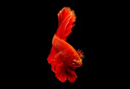 The image features a close-up of a vibrant red fish with multiple fins extending from its body, positioned against a dark background which gives the impression of depth. The lighting emphasizes the texture and color of the fish's scales and gills, creating a visually striking contrast between the red of the fish and the black surroundings.