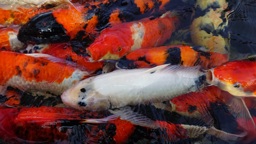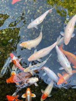 The image features several types of koi fish in an outdoor pond, possibly on display at a nursery or for sale.