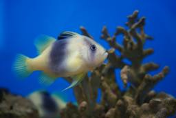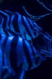 The image shows an underwater scene featuring coral reefs and various marine life. Prominently, there is a vibrant blue fish with black stripes swimming amidst the sea creatures. The environment suggests a healthy ecosystem with diverse species coexisting in their natural habitat.