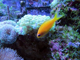 Underwater scene featuring a large orange coral with multiple small fish around it. The fish are brightly colored with stripes and spots in black, white, and red patterns.