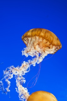 Underwater scene featuring two jellyfish floating near the surface of the ocean, set against a deep blue background with a slight gradient to lighter shades at the bottom.