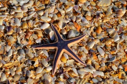 The image features a starfish lying on a sandy beach, which is covered in small seashells and pebbles of various colors.