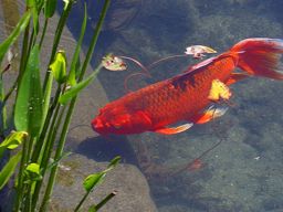 The image depicts an orange goldfish swimming in what appears to be a pond or aquarium, surrounded by green plants. The fish is the central focus of the image and its vibrant color stands out against the more muted surroundings.