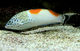 The image is of an underwater scene featuring a fish. The fish is small, orange and white in color, with spots across its body. It appears to be swimming at the bottom of the frame, possibly near coral or sandy terrain. The water has subtle ripples, suggesting movement from the fish.