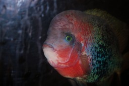 This is an image of a red, blue, and orange fish with shades of yellow and pink highlights in the aquarium tank. The background appears to be dark, indicating it could be in a cave or underwater environment. The fish has its fins extended horizontally while swimming forward.