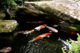 This image depicts a tranquil scene of a pond, likely situated in a Japanese garden setting. There are several Koi fish visible in the water, swimming peacefully among rocks and greenery.