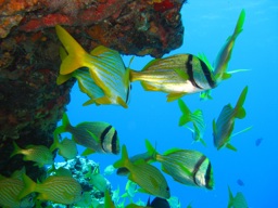 Underwater scene with a variety of colorful fish, including yellow and black striped ones, swimming among coral reefs in clear blue ocean water.