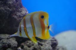 The image shows a vibrant tropical fish, likely a type of butterflyfish, known for its bright colors and striking patterns. The body is primarily yellow with blue stripes running along the side and darker blue spots scattered across it. There are two small antenna-like structures on either side of its head, which can be characteristic of this species. The fish has a large eye and a broad, white snout that stands out against the rest of its body. It is positioned close to the camera, giving viewers a clear look at these features. The background suggests an underwater environment with rocks and possibly seaweed or coral, indicating that this photo was taken in an aquarium setting.