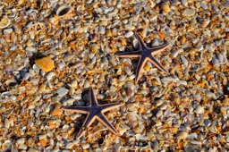 This is an image of sandy beach covered with small, colorful shells and two starfish resting on the surface.
