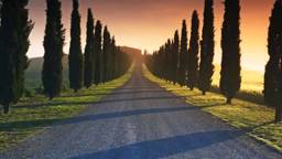The image depicts a picturesque scene of a road lined by cypress trees, leading towards a sunset or sunrise with warm hues in the sky. The setting appears to be a peaceful and serene landscape, possibly in Italy given the style of the trees.