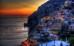 This image captures the vibrant coastal village of Positano, Italy at dusk. The buildings, which are perched on the side of a steep cliff overlooking the sea, twinkle with colorful lights against the deepening sky, creating a picturesque scene that seems to be straight out of a dream.