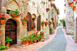 The image depicts an idyllic street in what appears to be a historical European city, possibly in Italy given the architecture and style of the buildings. The buildings are constructed from stone or bricks with wooden doors, shutters, and flower boxes adorned with blooming flowers lining the walkway. There is no text visible on the image, and it is presented as a serene, picturesque scene typical of tourist attractions or residential areas in historic cities.