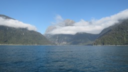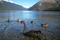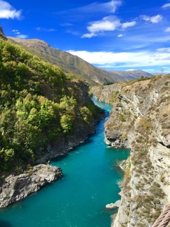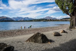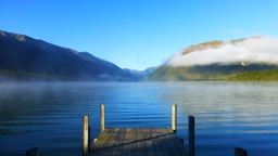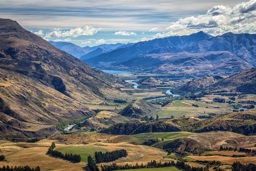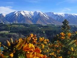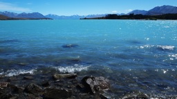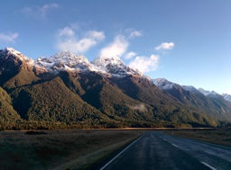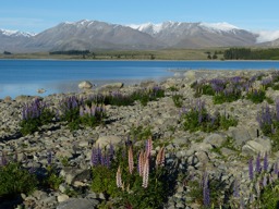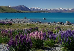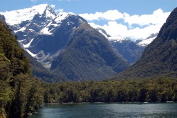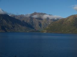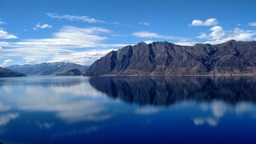 A scenic landscape of mountainous terrain, possibly in New Zealand, with blue skies and clear water in the foreground.