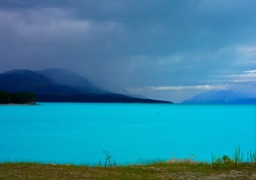 The image depicts a vast expanse of clear blue water, which appears to be a lake situated in a mountainous region with a stormy sky above. The contrast between the calm waters and the turbulent clouds creates a dramatic effect. There are no visible human figures or distinguishable landmarks in the image.