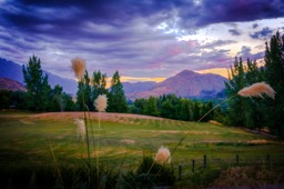 The image captures a serene landscape at dusk, with tall, majestic mountains in the distance under a clear blue sky. In the foreground, there is a grassy field with a few scattered trees. The sun appears to be setting, casting long shadows and highlighting the warm tones of the scene.