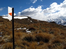 The image depicts a mountainous landscape, likely in New Zealand's Southern Alps given the snowy peaks and lush greenery at the lower elevations. A red trail marker is prominently placed against the backdrop of the mountains, indicating a hiking trail or pathway. The sky is partly cloudy with patches of blue suggesting good weather conditions.