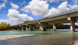 An image of a concrete bridge spanning over water on a sunny day with clouds in the sky and greenery around.