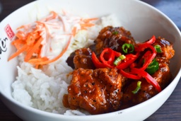 A large bowl of Chinese food containing rice, meat (likely chicken), and vegetables such as carrots and peppers. The dish is served in a restaurant with the name 'Bamboo' visible on the wall behind the counter.