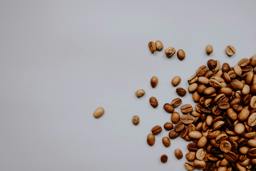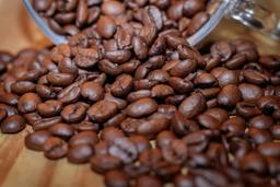 The image shows a large number of coffee beans, some of which appear to have been spilled or scattered across a surface.