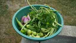 A green plastic bowl filled with fresh herbs and vegetables, possibly from a garden harvest.