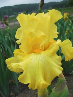 This image features a close-up view of a bright yellow iris flower against a natural outdoor background, possibly in the spring season. The flower is fully bloomed with petals that are curled and have droplets of water on them, suggesting it has recently rained or been misted. There are no texts visible in the image.