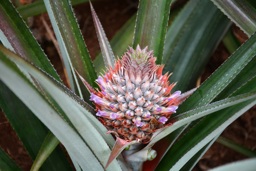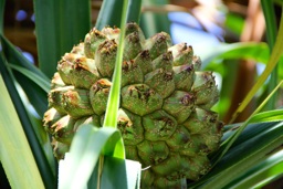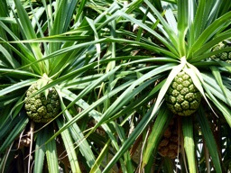The image is of tropical plants and fruit, possibly an exotic location. The fruits appear to be pineapples growing on the trees.