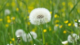The image shows dandelion seed heads floating in the air amidst green grass.