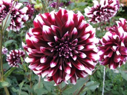The image displays a close-up of a vibrant and colorful flower, specifically a chrysanthemum. The bloom is rich with red and white petals and exhibits intricate detailing that is typical for this type of flower. There are multiple chrysanthemums in the background, suggesting they are part of a garden or display setting.