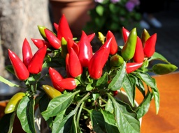 A potted plant with red jalapeño peppers growing in bunches. The peppers are vibrant and appear to be ready for picking.