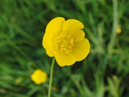 The image is of a single yellow flower with multiple petals and a bright yellow center, set against a blurred green background that could be grass or other foliage.