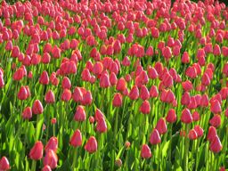 The image displays an array of vibrant pink flowers, likely roses or similar in type, arranged in neatly trimmed bushes with green leaves. The arrangement gives off a serene and colorful ambiance.