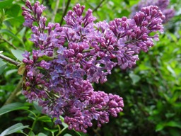 Close-up of brightly colored purple flowers, possibly lilacs, in a natural setting with green foliage.
