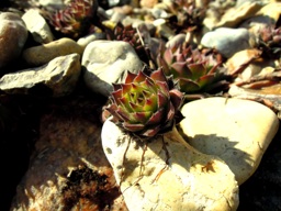 A photograph depicting a succulent plant with green leaves and fuzzy orange flowers, growing amidst small stones on the ground. It appears to be sunlit daytime.
