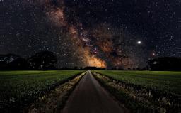 The image depicts a night scene where a clear view of the Milky Way galaxy is visible in the sky above a country road flanked by green fields. A crescent moon hangs low in the sky, suggesting it's either dawn or dusk.