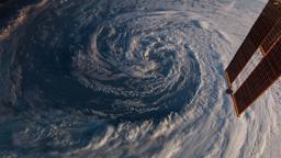 The image shows a satellite view of a large storm system, likely a hurricane or typhoon, with spiraling cloud bands and deep convection visible in the center. The ocean below is calm, which contrasts with the turbulent atmosphere above.