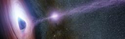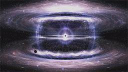 The image shows an artistic representation of a black hole in space, surrounded by stars and nebulous clouds. The black hole is depicted with concentric rings emanating from it, possibly representing the event horizon or ripples in spacetime. The color palette is predominantly dark blues and purples, conveying the vastness of outer space. This image can be classified as 'Safe'.