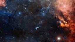 The image displays a vibrant and colorful space scene, featuring nebulae and stars that give an impression of a cosmic landscape. The colors range from deep blues to bright oranges, suggesting the setting might be a galaxy or a planetary system. The art style is detailed and realistic with respect to astronomical phenomena but may not be entirely scientifically accurate due to artistic interpretation.