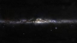 The image depicts a galaxy, specifically the Milky Way galaxy, viewed from an Earthly perspective within our solar system. The photo is a composite of various images taken by astronomical telescopes and space probes over several years. It showcases the vastness of space, the countless stars within the galaxy, and nebulae formed in the interstellar medium.