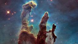 This image captures a detailed and colorful view of the Pillars of Creation, a well-known celestial nebula in space. The nebula is filled with dense clouds of interstellar gas and dust, illuminated by countless stars embedded within it. The intricate details and vibrant colors provide an up-close look at the complex structures that make up this iconic astronomical feature.